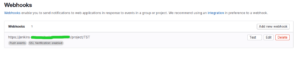 В проекте gitlab в разделе Settings -> Webhooks в поле URL прописываю url проекта Jenkins: https://jenkins-samedomain.tech/project/TST , в поле Secret token — сгенерированный токен доступа.